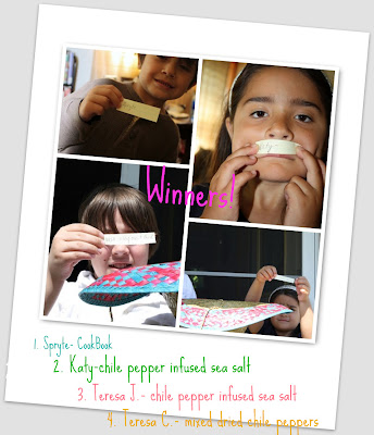 2. Katy- You won a chile pepper infused sea salt...I know you're not big on spicy, but the salts just add a hint of flavor, I think you'll be pleasantly surprised!
